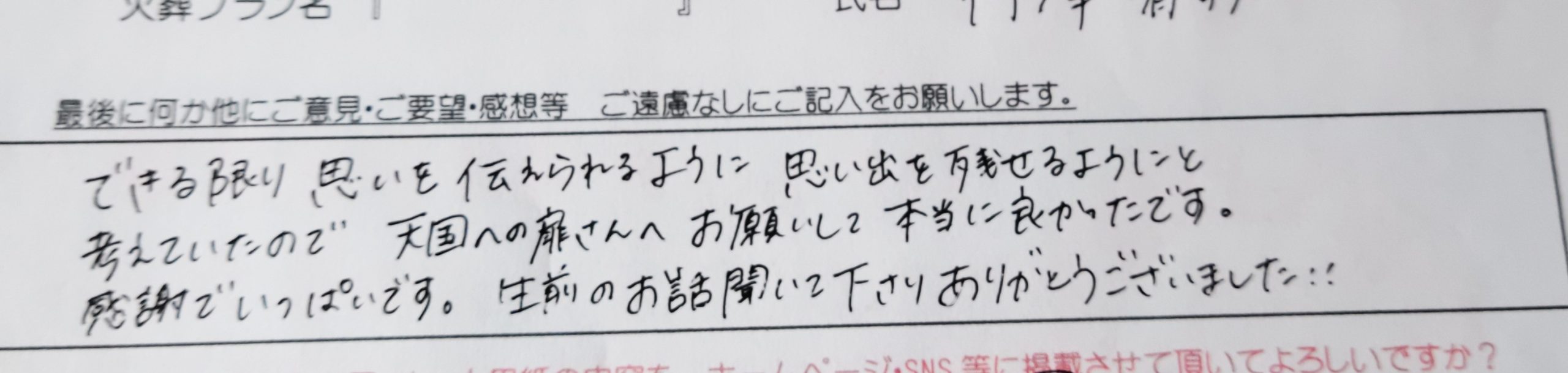できる限り思いを伝えられるように 思い出を残せるようにと考えていたので 天国への扉さんへお願いして本当に良かったです。 感謝でいっぱいです。 生前のお話聞いて下さりありがとうございました。