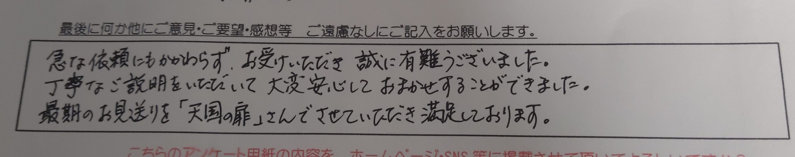 急な依頼にもかかわらず、お受けいただき 誠に有難うございました。 丁寧なご説明をいただいて大変安心しておまかせすることができました。 最期のお見送りを「天国の扉」さんでさせていただき満足しております。