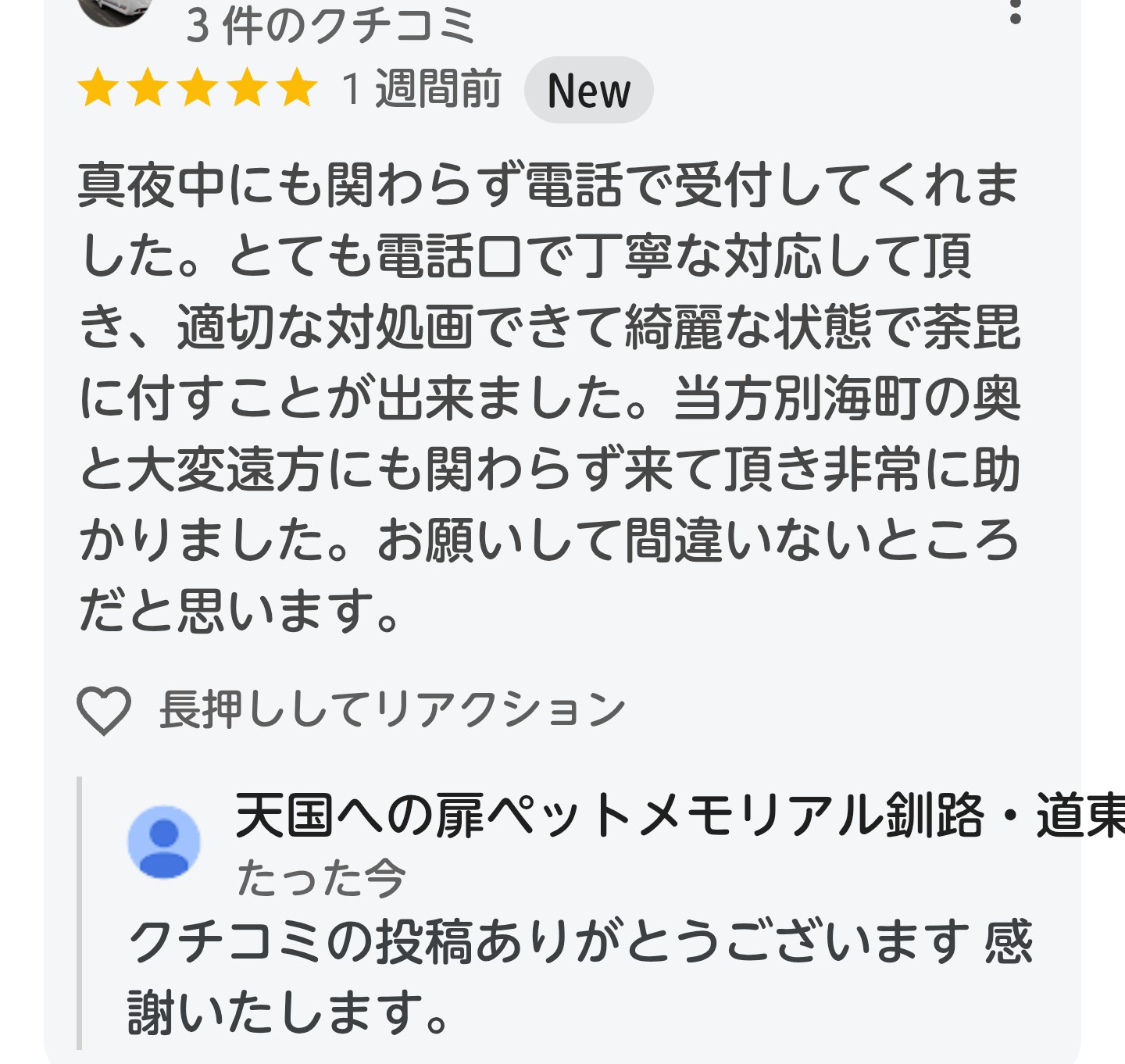 真夜中にも関わらず電話で受付してくれました。とても電話口で丁寧な対応して頂き、適切な対処ができて綺麗な状態で荼毘に付すことが出来ました。当方別海町の奥と大変遠方にも関わらず来て頂き非常に助かりました。お願いして間違いないところだと思います。